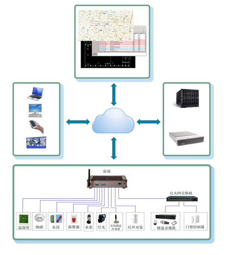 子系統(tǒng)主要包括:環(huán)境監(jiān)測(cè)系統(tǒng)、無(wú)線設(shè)備測(cè)溫系統(tǒng)、煙火監(jiān)測(cè)系統(tǒng)、門(mén)磁監(jiān)測(cè)系統(tǒng)、入侵監(jiān)測(cè)系統(tǒng)、水浸監(jiān)測(cè)系統(tǒng)、視頻監(jiān)控系統(tǒng)。